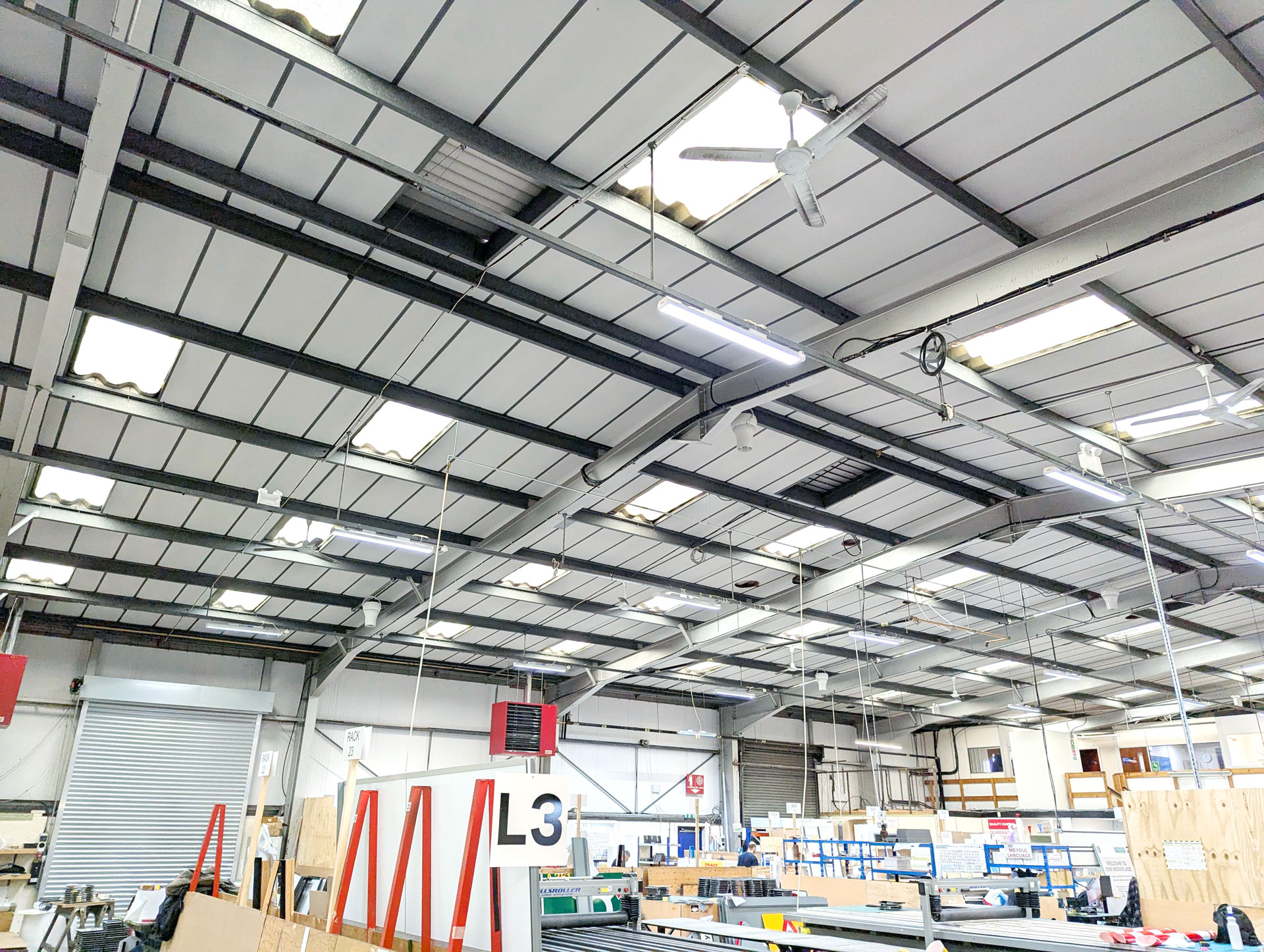 As part of its Net Zero commitment, Nuneaton Signs commissioned an independent energy audit to identify opportunities for reducing energy waste and improving efficiency. This revealed a significant temperature imbalance between the floor and ceiling across its 1,500m² facility, which featured a sloped ceiling, measuring 5.75m at the walls, rising to 6.75m at the apex.