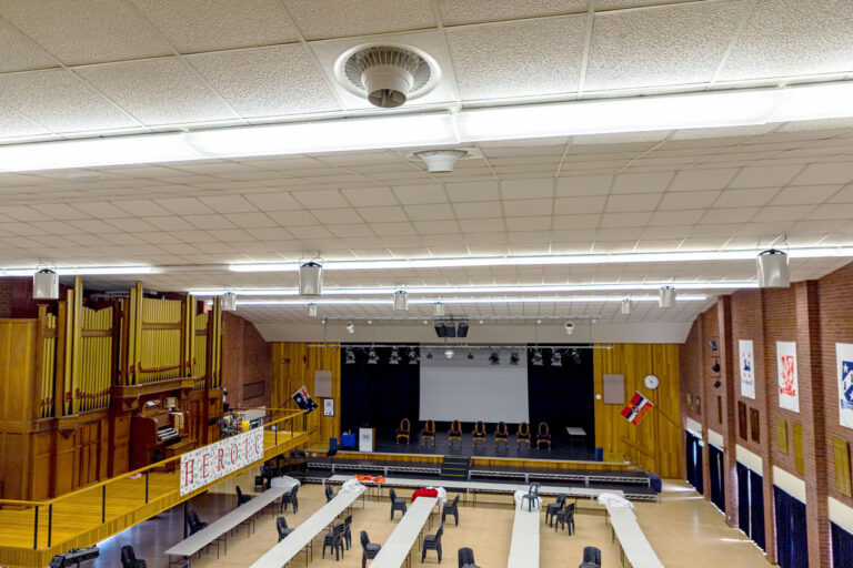 In winter, warm air accumulated at ceiling level, leaving floor level cold despite heating. In summer, heat buildup created discomfort for students, staff, and visitors. Any solution had to be quiet, discreet, and energy-efficient while preserving architectural aesthetics.